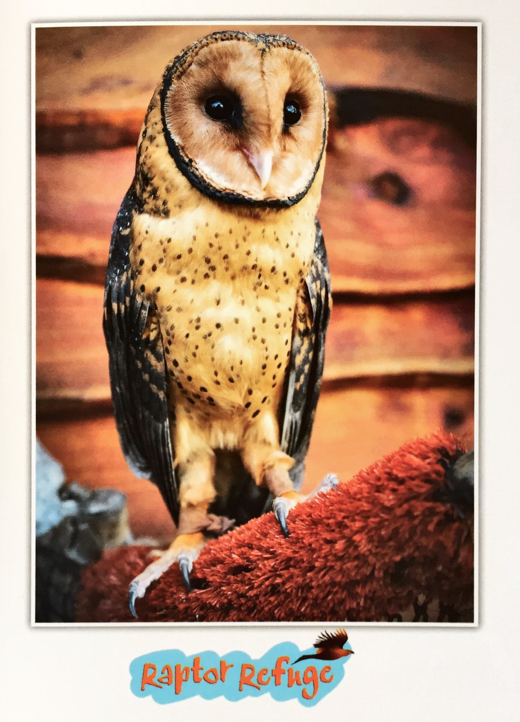 A unique gift card of a resident Masked Owl at Raptor Refuge. Photography by Luke O’Brien.
